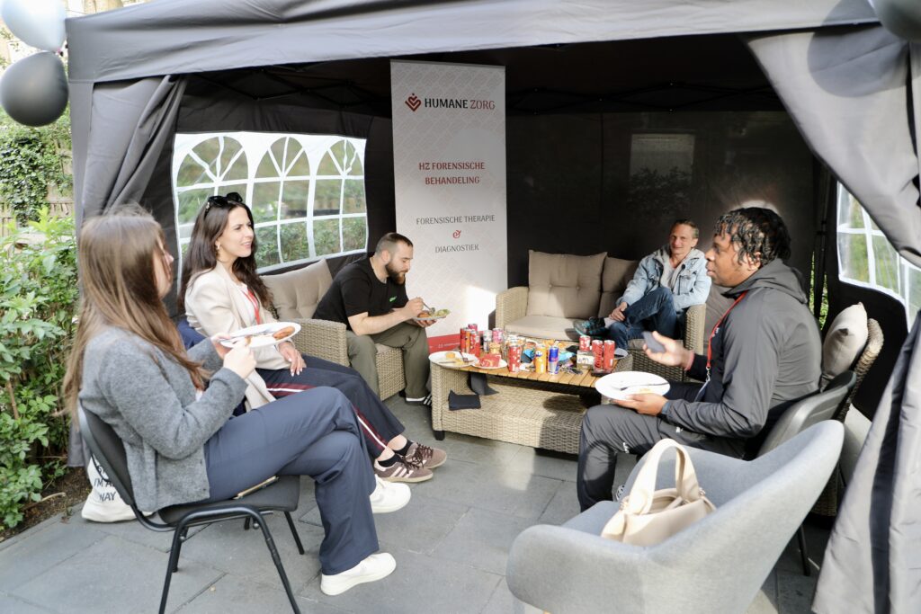Het weer kon niet beter. In de tuin van het kantoor in hartje Rotterdam Zuid stond donderdagavond de barbecue aan. De partytent met loungebank ziet er uitnodigend uit. Bewoners en begeleiders staan gemoedelijk te kletsen; over het weer, het eten of wat ze die dag hebben gedaan.